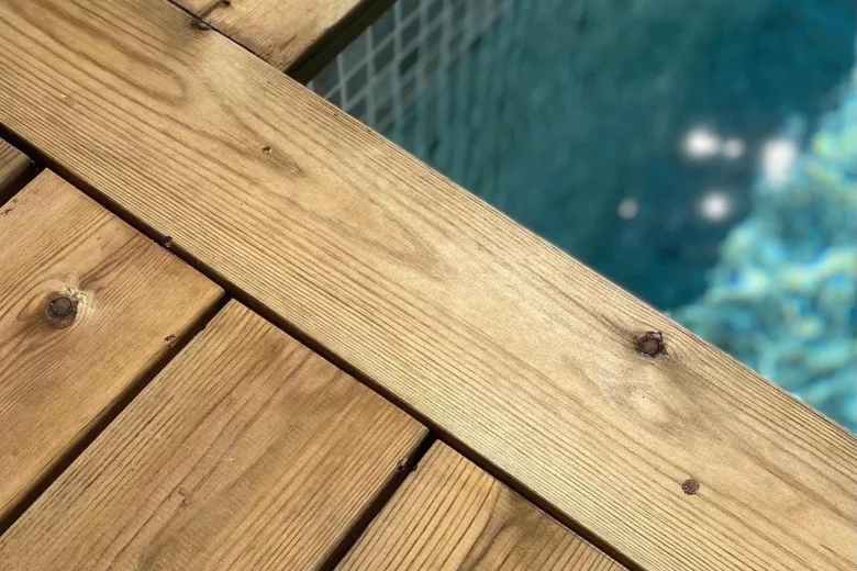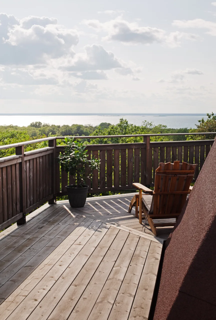 Det vackra grånandet i Linax Natur gör att altanen smälter ihop med landskapet och förstärker känslan av att huset hör hemma just här.