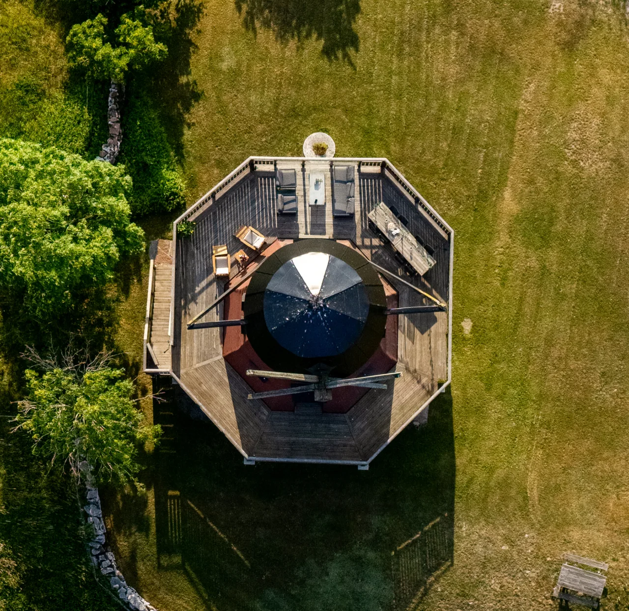 När de renoverade altanen och skapade sin utedusch valde de Linax Natur – både för det naturliga uttrycket och för hållbarheten som behövs på en så utsatt plats. Det mjuka, vackra grånandet passar perfekt in i landskapet och gör att kvarnen smälter samman med sin omgivning.